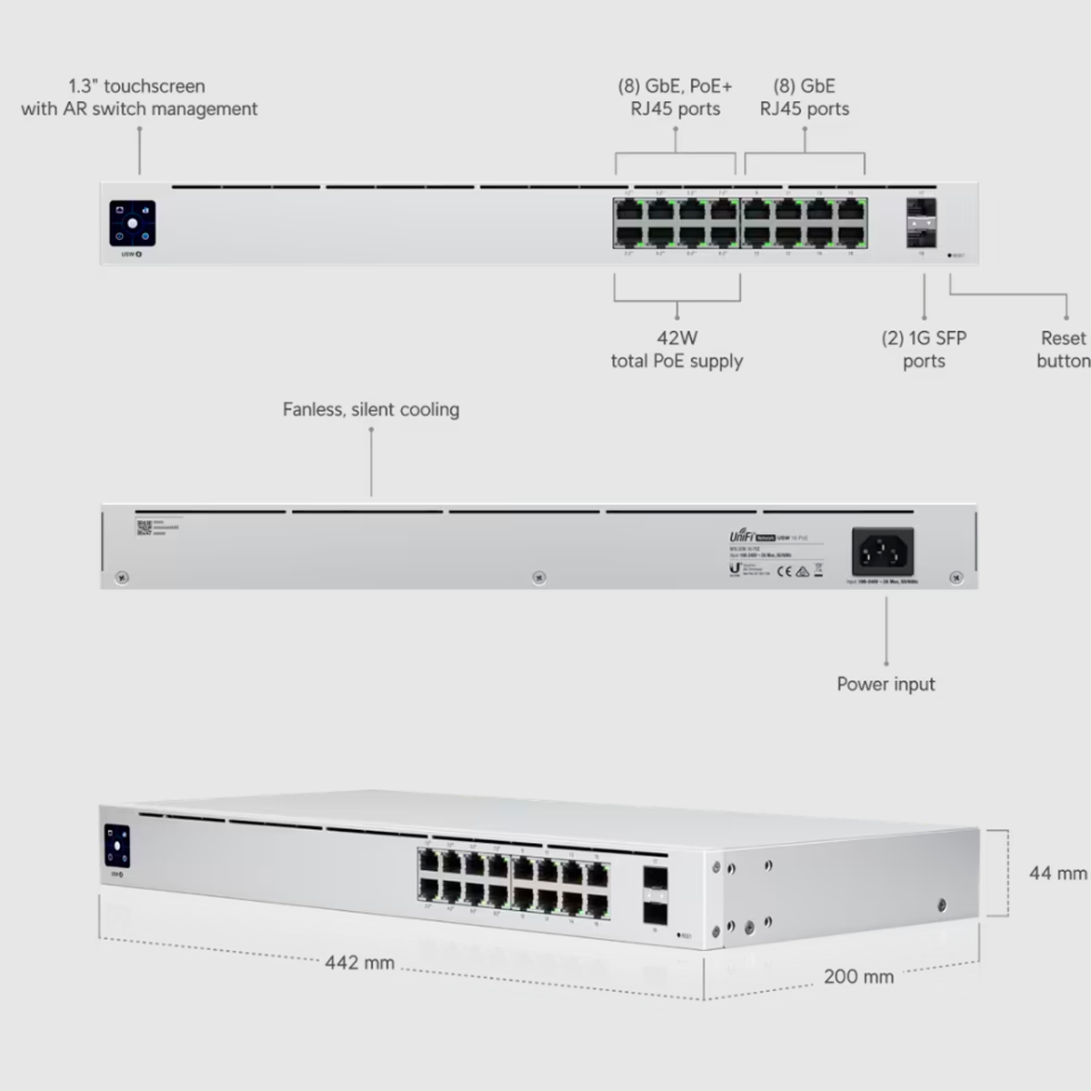 Switch Administrable Ubiquiti UniFi 16 puertos 42W PoE+ SFP USW-16-POE-AR